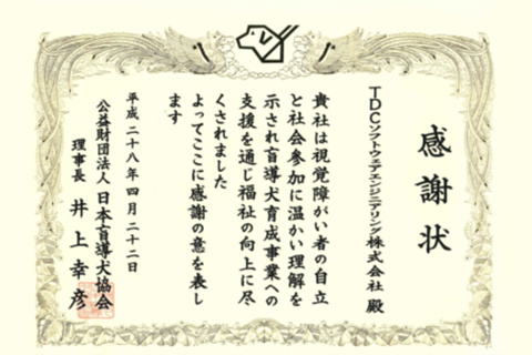 継続した活動が認められ、日本盲導犬協会から感謝状をいただきました。