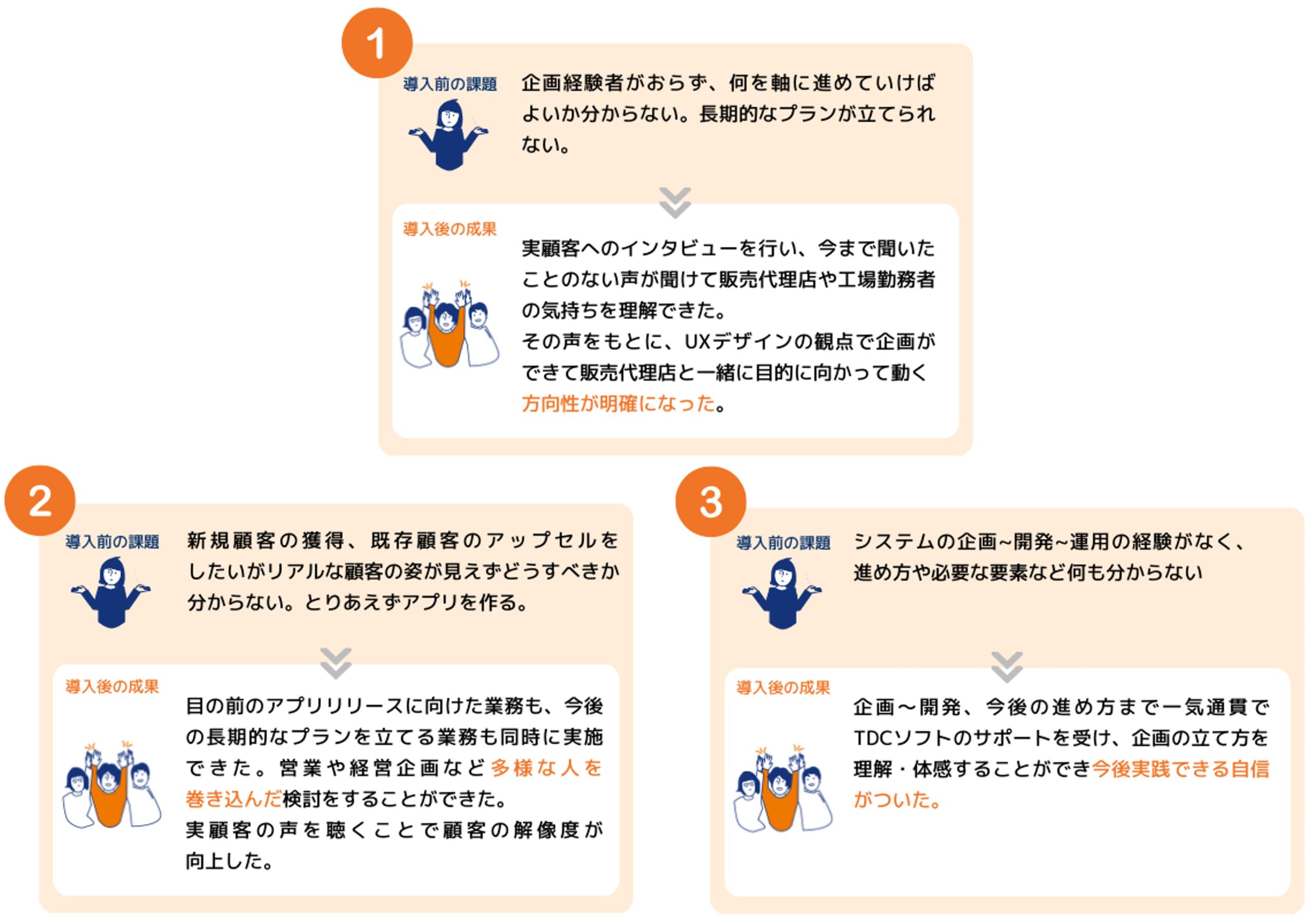 TDCソフトが主体となり顧客も巻き込んで共にUXデザインを行うことで顧客側にノウハウが蓄積され、顧客自身でもUXデザインを活用して企画立案を行うことができるようになった。また、顧客間で認識を合わせて全員が理解・納得しながら進めることにより新規サービス企画をより自分事化することができた。今後も企画を立てる際はユーザ目線で価値ある体験を検討することができることだろう。