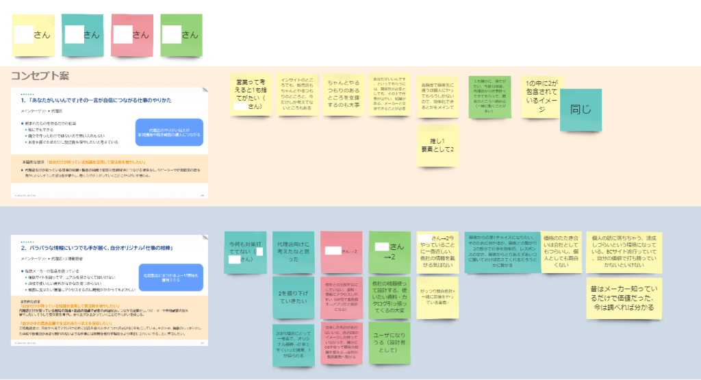 インサイトと決定したコンセプトに基づき、代理店に提供する具体的な施策のアイディアを出した。参加者個人で持っているアイディアを出す手法(ブレインダンプ)とグループで会話をしながらアイディアを出す手法(アイディアしりとり)を実施し多くのアイディアが集まった。その後、出したアイディアに対し、どれがユーザに喜ばれ、効果が高いのか参加者全員でディスカッションを行った。