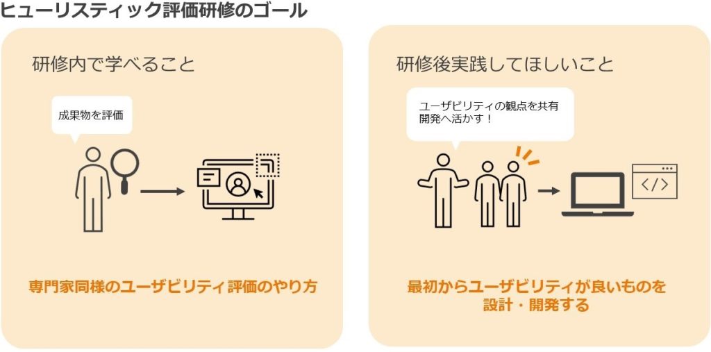 このユーザビリティに対する知識、設計・評価方法を正しく身に付け、計画的に作り込めるようになれば、自然とこの問題を回避できる。そういった想いを持って、TDCソフトでは「ヒューリスティック評価研修」を提供している。ヒューリスティック評価とは、専門家がユーザビリティの観点から製品を評価するものである。研修受講後、専門家同様のユーザビリティの評価ができるようになるだけではなく、受講者がユーザビリティの専門家としてユーザ目線で製品を作り、評価できるようになる、そういった研修を目指してコースの設計を行っている。