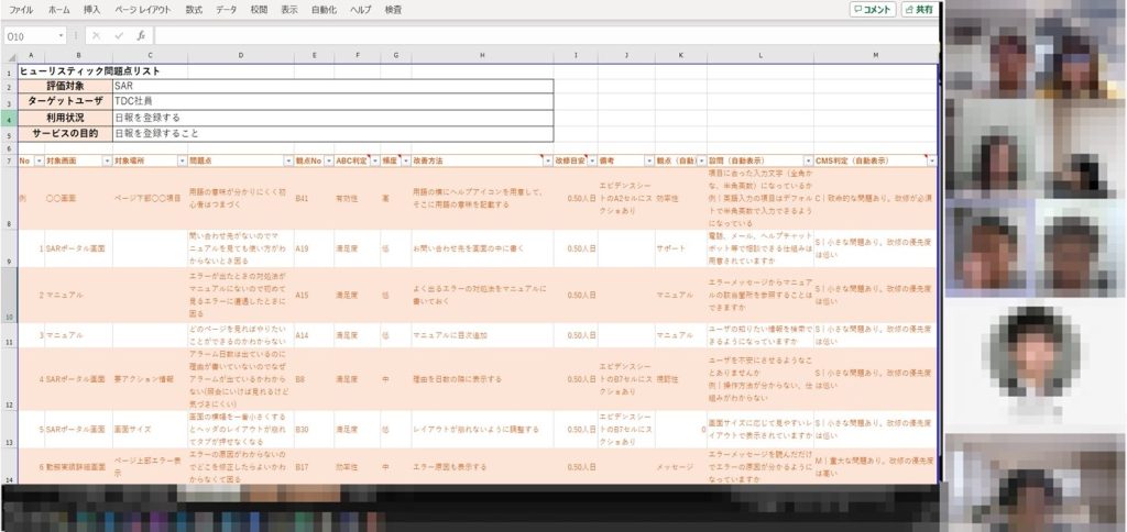 テスト中評価者が気になるところを見つけたら、観点表の対象画面、対象場所、問題点、観点No、ABC判定、頻度を入力することで、問題の重要度(CMS判定)を自動で算出してくれるものとなっている。過去の受講者の方からも、「誰でも使えそうなので研修に参加できなかったメンバにもぜひ広めたい」とのお言葉をいただいている。