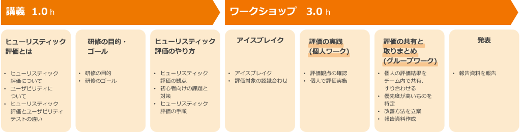 講義では、初学者でも理解・実践できるよう、評価の目的や、ユーザビリティの定義、ヒューリスティック評価の観点を一から学ぶ。その後、ヒューリスティック評価のやり方、よくある課題と対策を学ぶ内容となっている。ヒューリスティック評価の観点の講義では、知識のある方でも新たな気付きを得られるよう実例を多く取り入れた内容となっている。