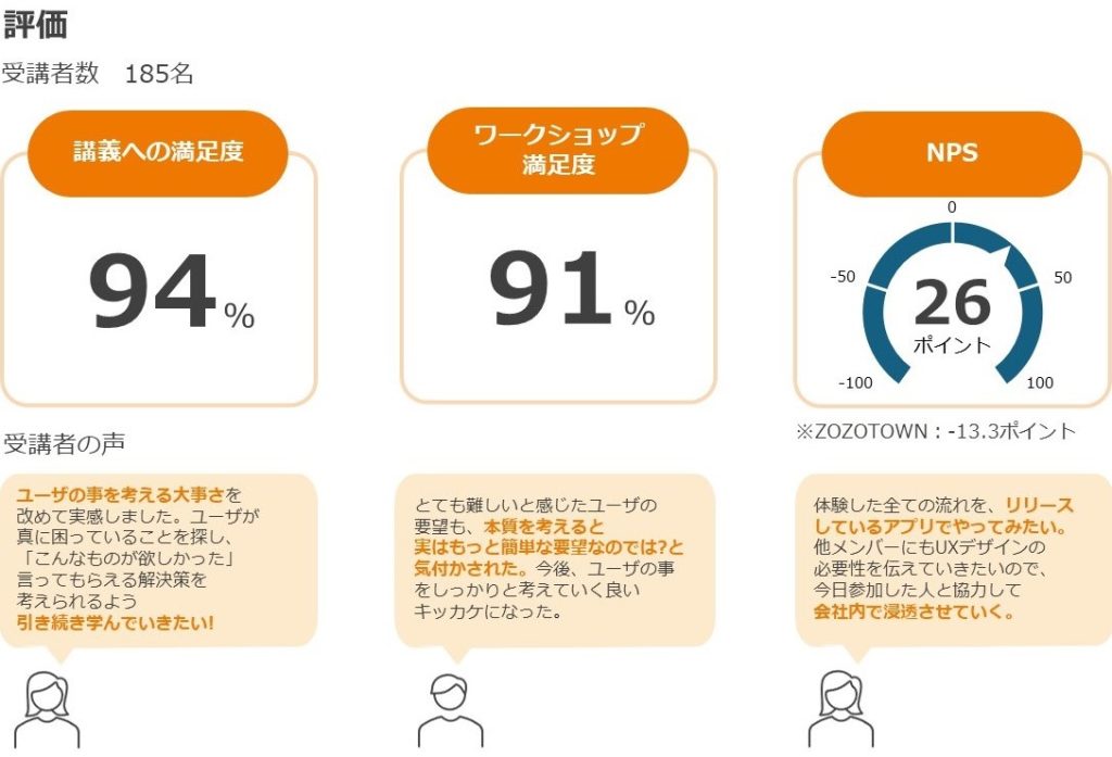 最初は6.5時間のワークショップを長時間だと感じる方もいるが、ユーザの事を本気で考え、喜んでもらえる体験を形にし、評価を受けると、最後にはどこが足りなかったのか、もっと良くできるはずと、受講者の熱気に講師が圧倒される雰囲気となることが多い。ワークショップ後には、「まだまだユーザのことで気付けてない部分があった」、「もっとやりたかった」と一様に口にするほど熱中いただける研修となっている。