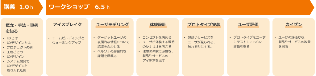 UXをデザインするにあって、どの様な考え方を持つべきか、どのような手法をとるのかを説明する。また、受講者の中には、これからUXデザインを実践していこうという方が多くいるため、UXデザインに取り組む価値や、メリット、UXデザインに関する事例も説明する。講義にてUXデザインの定義、考え方、手法、価値やメリットについて理解いただいた後、ワークショップに入っていく。