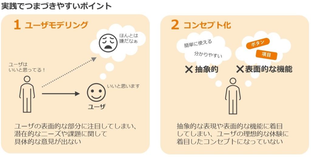 2つ目のポイントは、発見したユーザの潜在ニーズに対してどのような体験を提供すべきかの方向性を見出す、コンセプト化である。コンセプトは提供したい体験の方向性を定めるものだが、初めて考えると、抽象的に表現してしまい、方向性がぼやけてしまうことが多い。また、初学者の場合はシステム、製品、サービスの表面的な機能やUI部分に着目してしまい、ユーザの理想的な体験に着目したコンセプトになっていないことがある。コンセプトが洗練されないまま、製品やサービスを作った場合、ユーザに喜ばれないものを作ってしまうことにつながる。