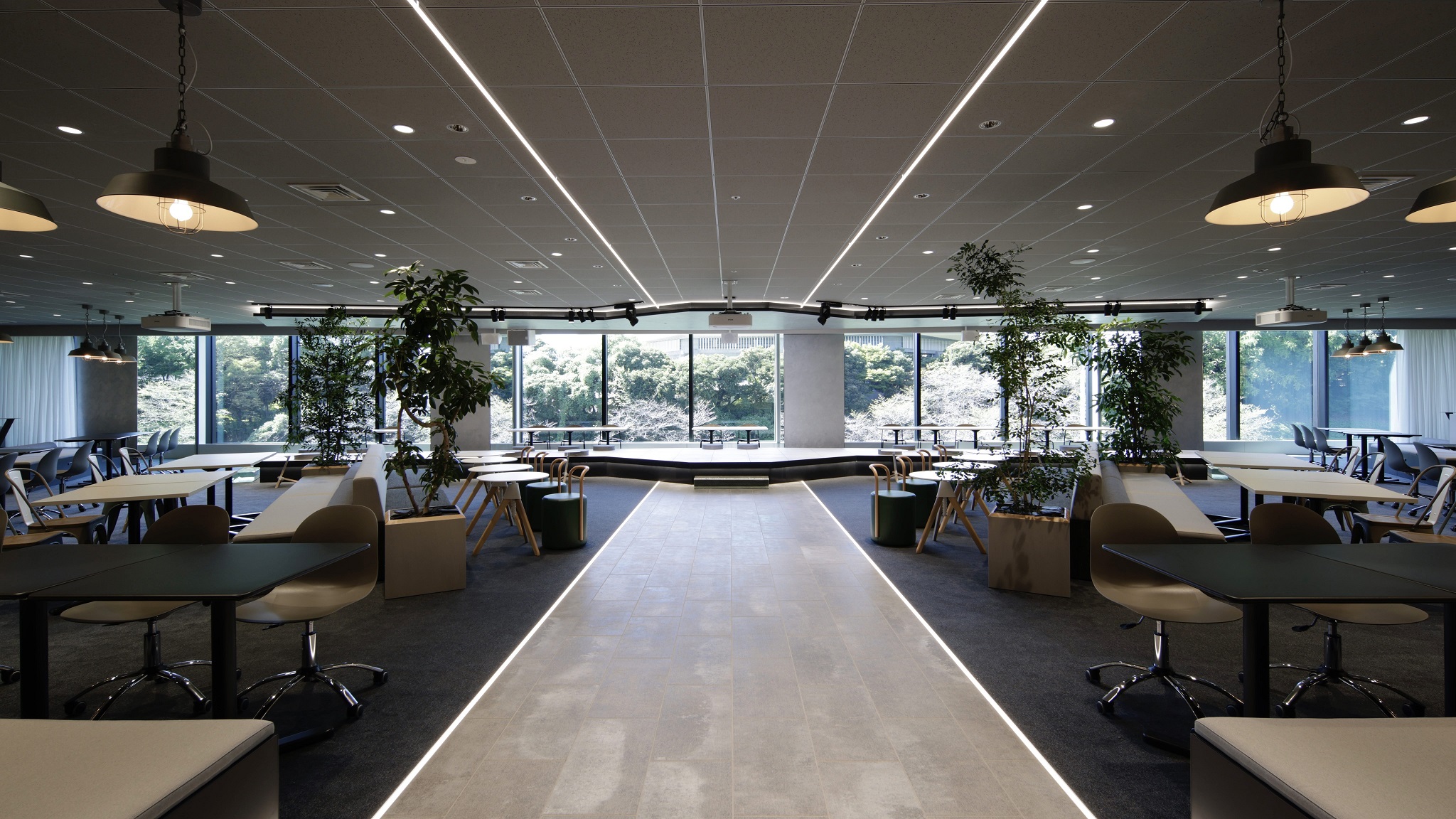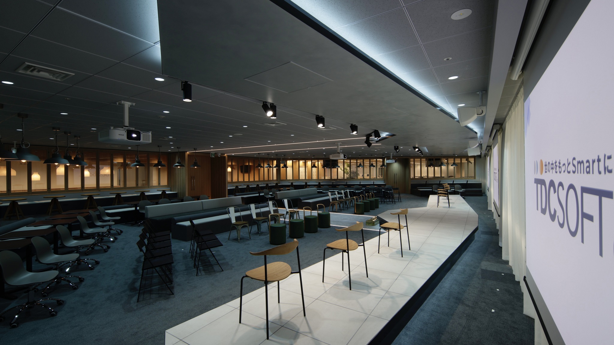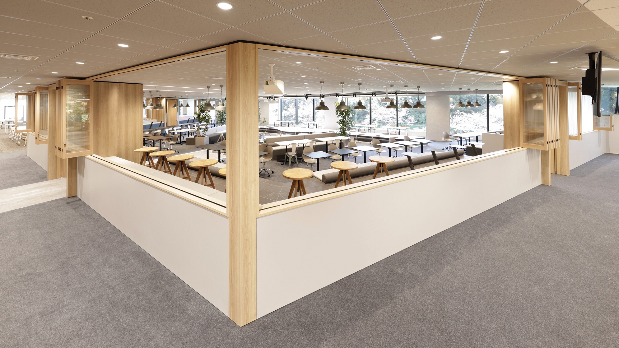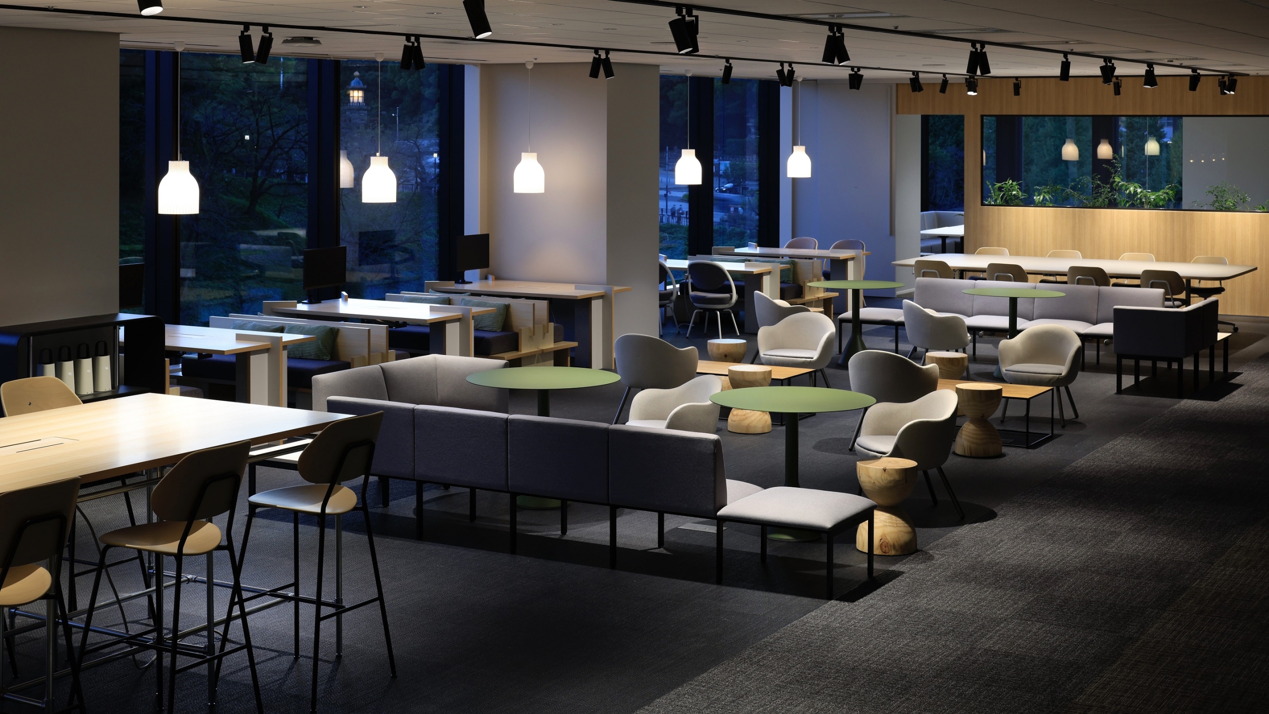 We are a systems integration company and many of our employees are stationed at client offices. We have created an environment that encourages employees to naturally circulate and interact with each other on the floor when they return to the office. In addition, in order to maintain views and interaction, we have eliminated walls that divide floor lines, providing a variety of zones that can be used by employees not only for work, but also for various other purposes. The areas where employees work for long hours are kept away from windows, which are easily affected by the climate, to ensure a comfortable work space, so that employees can work and communicate efficiently and more relaxed than in their homes or in client offices.