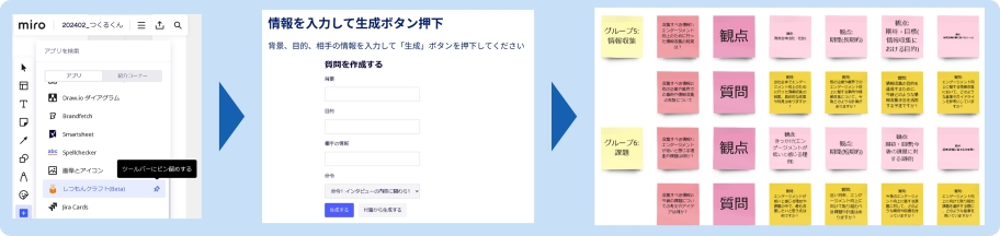 ChatGPT、Miro、および当社独自のUXデザインノウハウを組み合わせることで、質の高い質問を生成します。 -