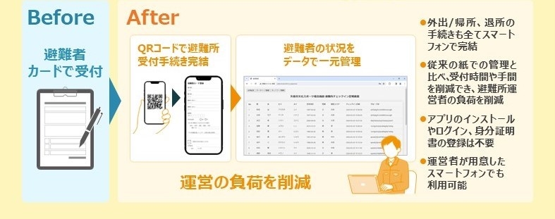 避難者情報の登録、管理をデジタル化することで、職員の事務負担を軽減し、迅速かつ正確な避難者管理を実現 -