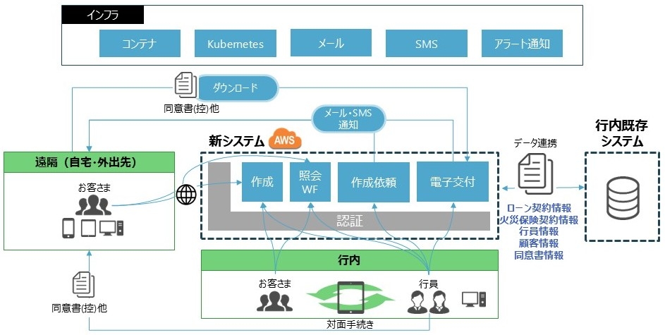 住宅ローンに付帯する火災保険の手続きのデジタル化も、DX推進の一環として一つの課題であった。住宅ローン自体は先行してWEBやスマホからの申し込みが可能になっていたものの、火災保険の手続きは依然として紙ベースで行われており、顧客の来店や行員の訪問が必要な状態であった。