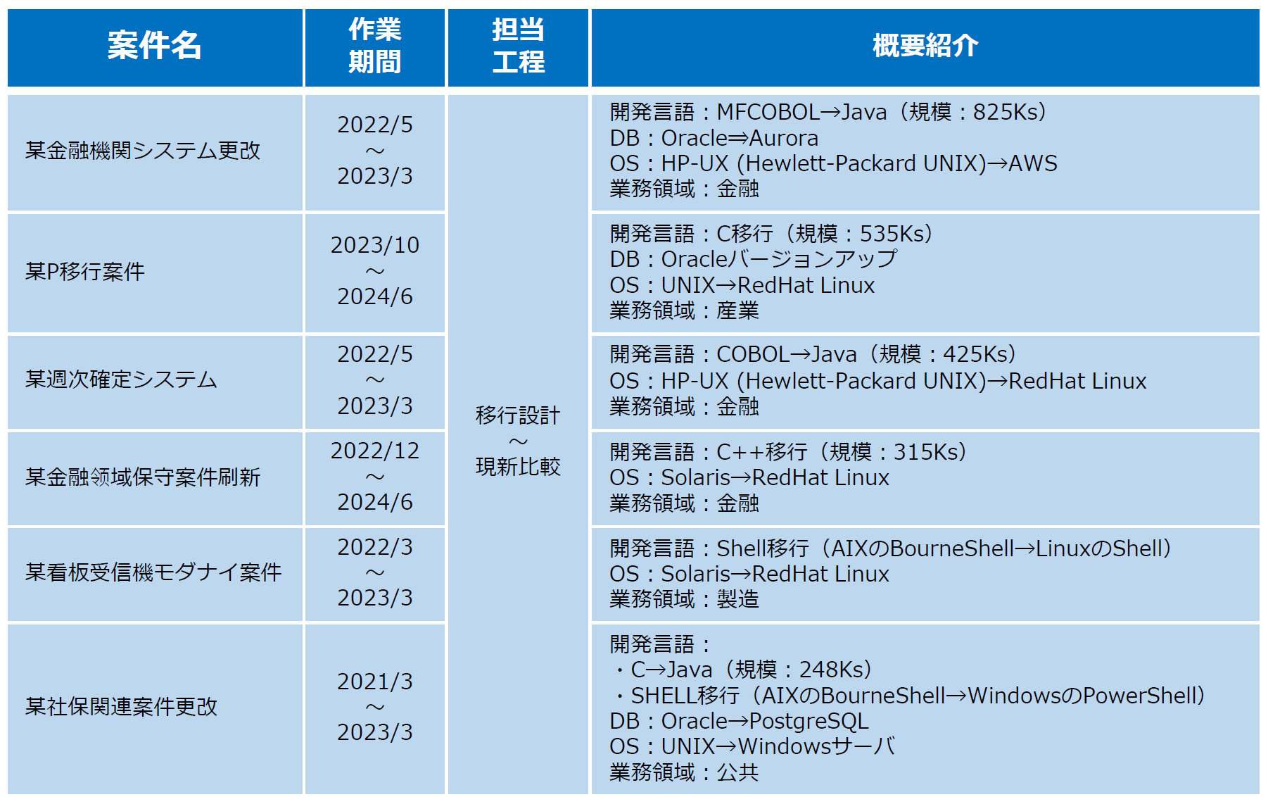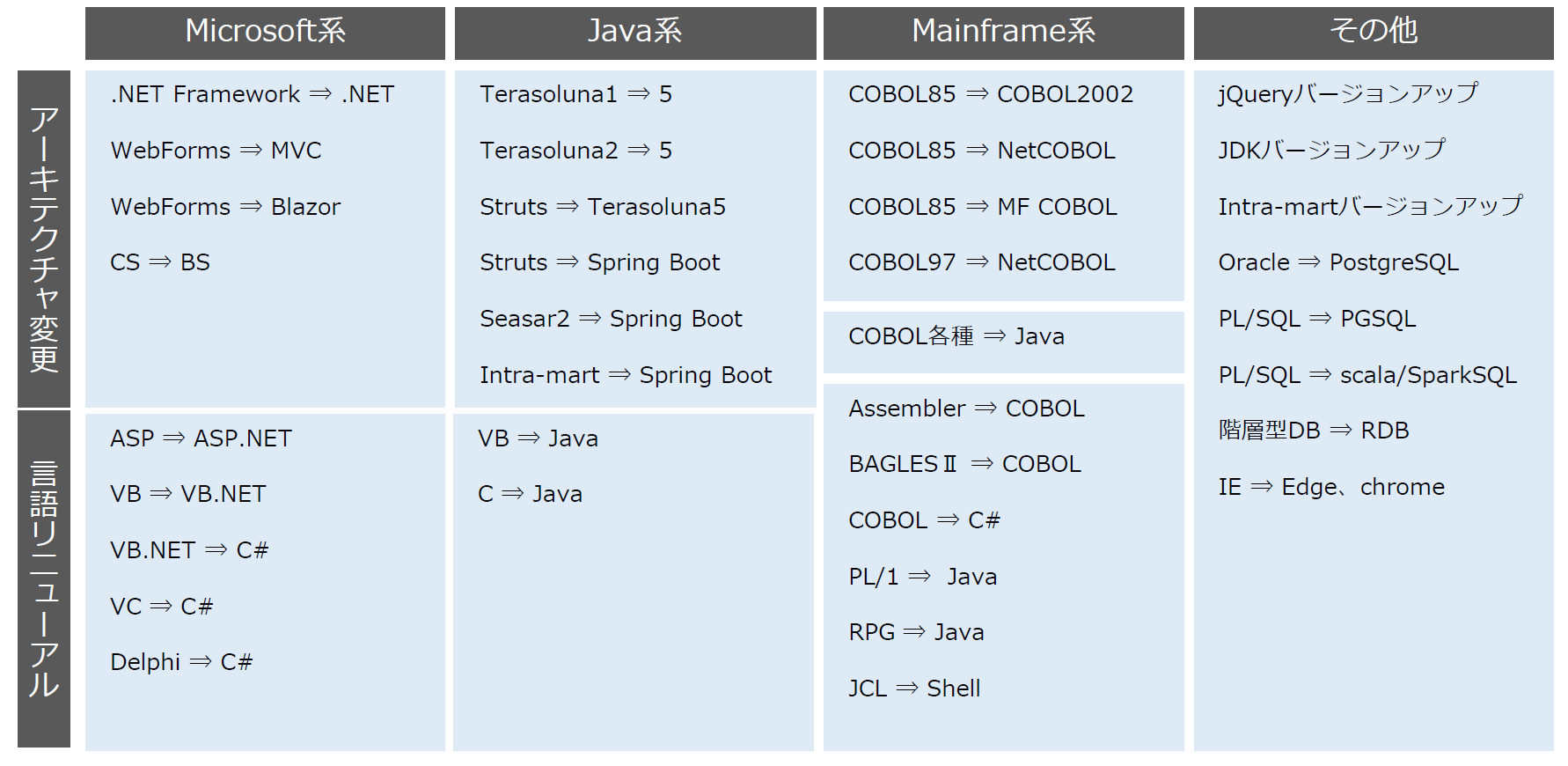 本編に掲載した以外にも幅広いパターンのマイグレーションに対応しており、お客様の様々なご要望や課題にお応えできます。具体的には以下のプログラム言語やフレームワーク等のマイグレーションやバージョンアップが可能です。こちらに記載が無いパターンにつきましても多くの事例を持っておりますので、柔軟にご相談を承ることが可能です。