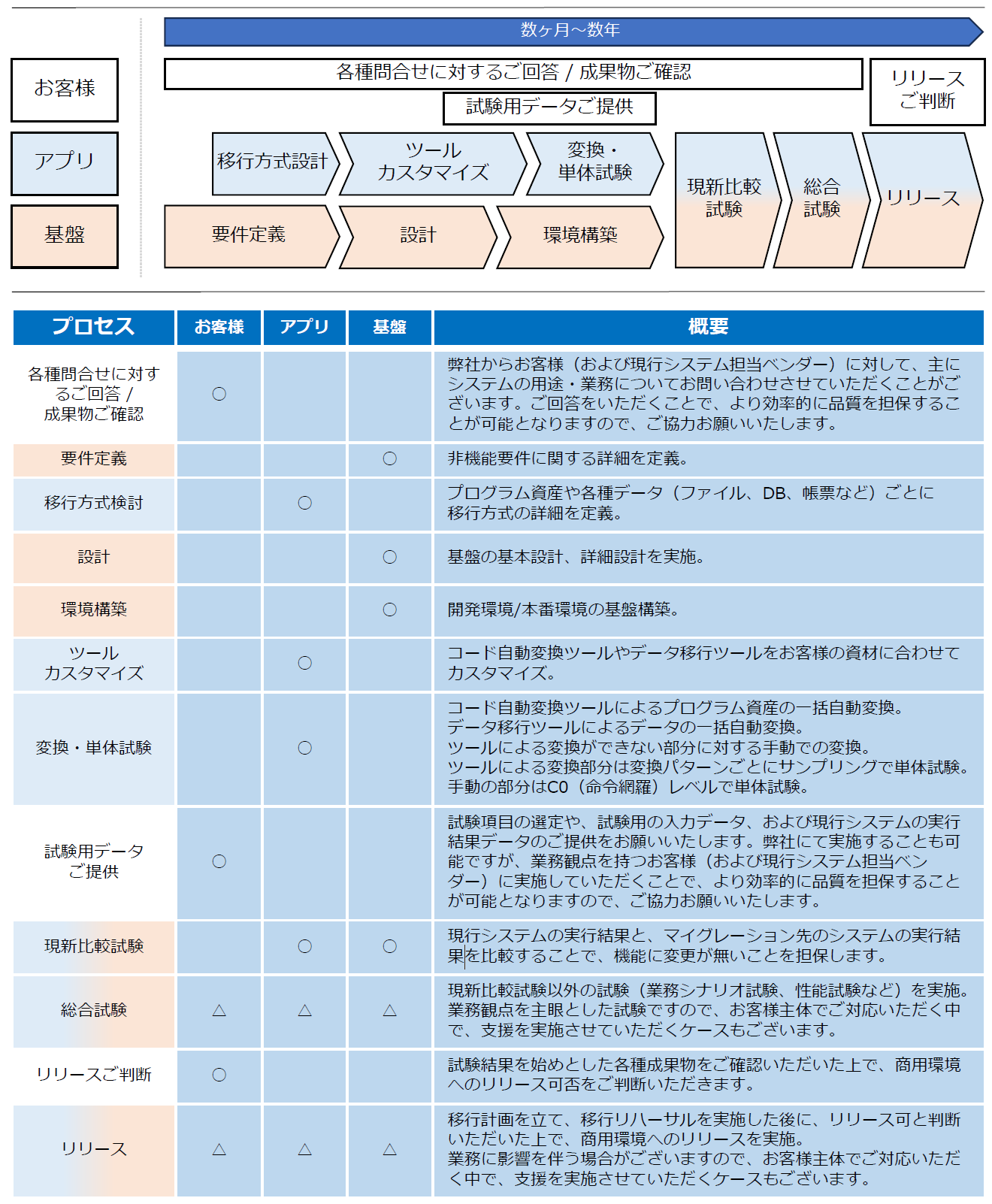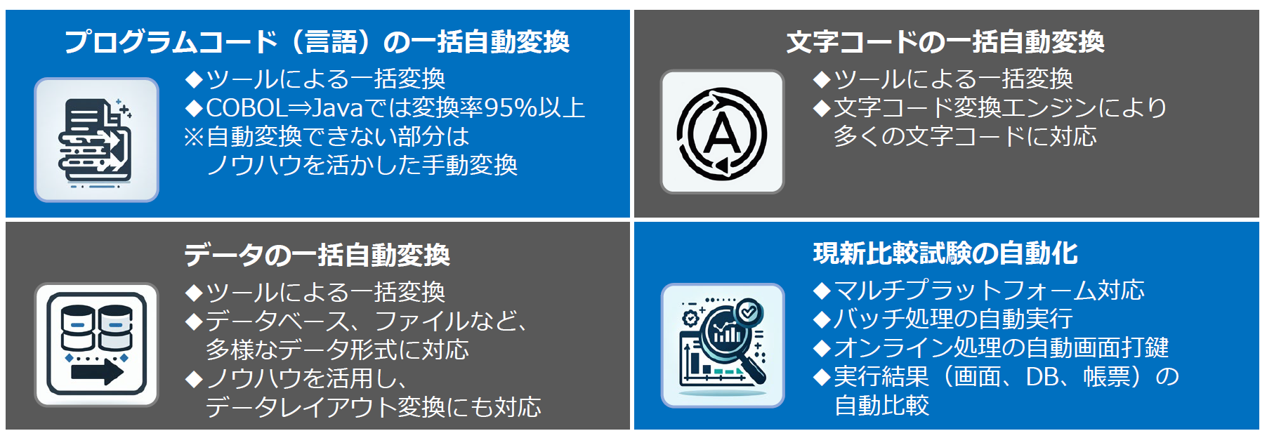 弊社のパートナー企業が保有する豊富な実績を誇るソリューション(詳細はAppendix参照)を活用することで、マイグレーションプロセスのコアとも言える、プログラム資産や文字コードの変換、データの移行、現新比較試験などの作業を自動化します。手作業を最小限に抑えることで人的ミスによるリスクを低減し、均質化や高生産性、低コスト化を実現します。