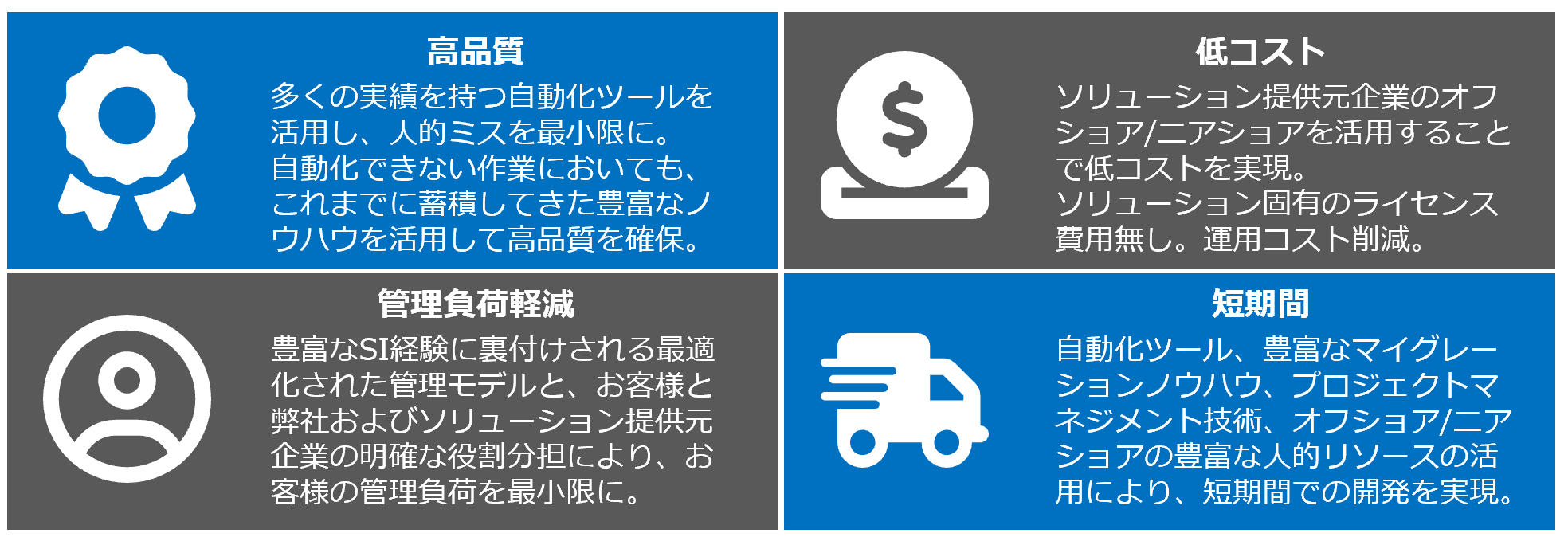 豊富な実績を持つソリューションを活用することで、高品質かつ低コストで移行を実現し、お客様のビジネスアジリティの創出に寄与いたします。
