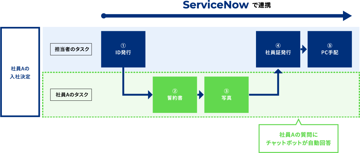 ServiceNowでは、ID発行後の一連の申請手続きがフローとして用意されているため、煩雑な紙書類のやりとりなどを行うことなく事務処理を完了できます。