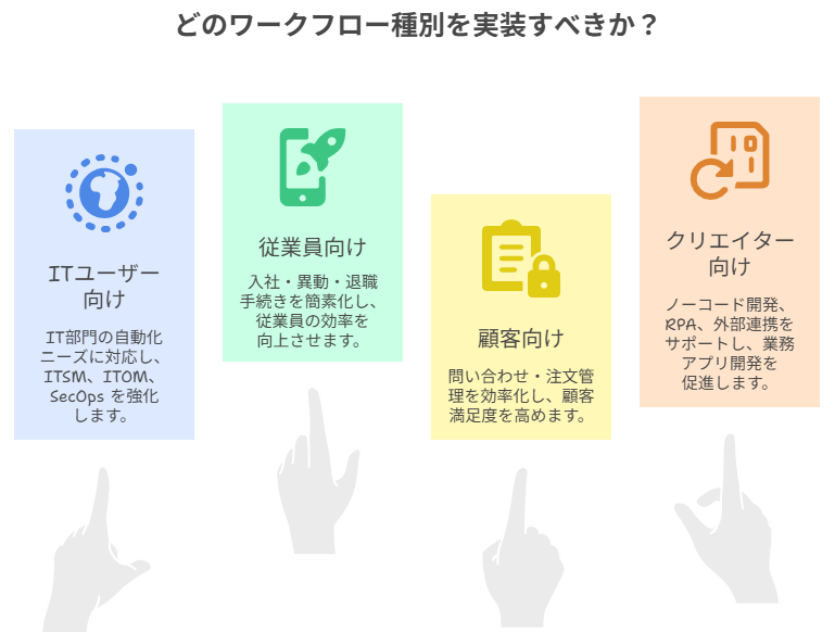 ServiceNowでは、利用者の目的に応じてワークフローが4つに分類されています。