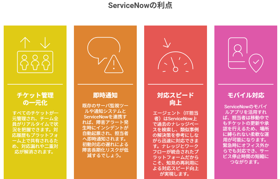• モバイル対応で場所にとらわれない運用: ServiceNowのモバイルアプリを活用すれば、担当者は移動中でもチケットの更新や承認を行えるため、場所に縛られない柔軟な運用が可能になります。緊急時にオフィス外からでも対応でき、サービス停止時間の短縮につながります。