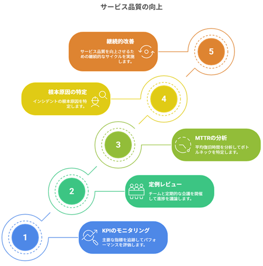ServiceNow導入後は、新しい仕組みを定着させつつ主要KPIを継続的にモニタリングします。ServiceNowに用意されたダッシュボードやレポート機能を活用し、インシデント件数・MTTR・SLA遵守率・再発率といった指標を見える化しましょう。週次・月次の定例サービスレビュー会議を開催し、設定した目標値に対する達成度をチームで確認します。特にMTTR(平均復旧時間)やチケット解決までの各工程を可視化することで、どの段階に時間がかかっているかを詳細に分析できます。問題管理プロセスを通じてインシデントの根本原因を究明し、再発防止策を講じるといったサイクル(いわゆる継続的サービス改善 = CSI)を回し続けることが重要です。小さな改善であっても継続することで、大きな品質向上につながります。