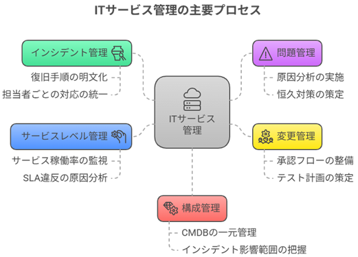 • 構成管理 – 構成管理データベース(CMDB)を用いてIT資産やシステム構成を管理するプロセスです。インフラ構成情報が散在していないか、CMDBで一元管理できているか確認しましょう。インシデント発生時に影響範囲を正確に把握するための基盤となります。
