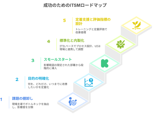 A2:現場主導で課題の棚卸しと目的の明文化を行い、スモールスタートとITILベースの標準化を徹底するのがベターです。