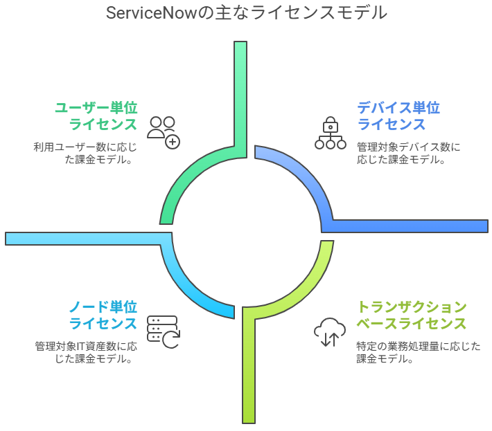 ServiceNowの導入を検討する際に、課題となるのがライセンス体系の複雑さです。主なライセンス方式として、以下のようなものがあります。