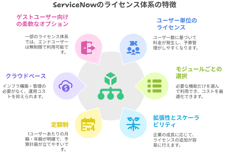 ServiceNowのライセンス体系は、企業のニーズに応じた柔軟なプランが特徴です。主な特徴として、以下の点が挙げられます。