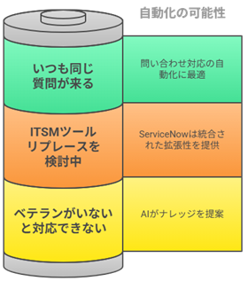 問い合わせ対応 自動化を導入しても、「AIがうまく答えてくれない」「結局人が対応している」という現場の声は少なくありません。これはAIの性能よりも、参照すべきナレッジが整備されていないことが原因です。ServiceNow Now AssistのようなAIエンジンは、蓄積されたFAQや過去対応履歴をもとに回答を導き出します。つまり、ナレッジの整備と分類が自動化の効果を左右する基盤となるのです。