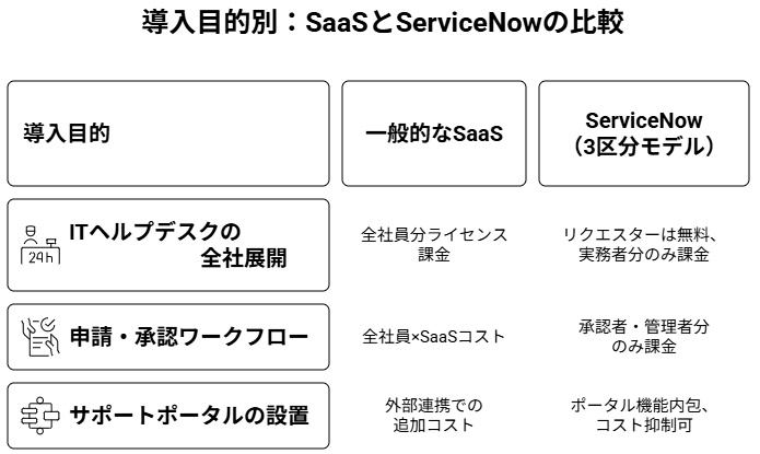 この構造により、ServiceNowは 「スモールスタート→全社展開」のスケーラビリティを備えたコスト設計となっています。