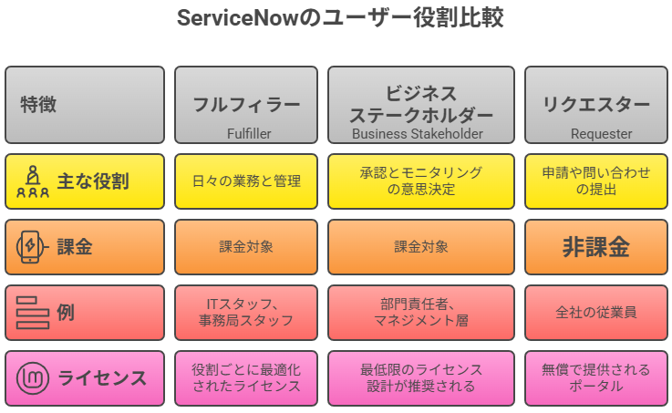 しかし、ServiceNowはその前提が異なります。実は、利用者の役割に応じて 課金の有無が変わる ― この点が大きな誤解を生んでいる要因なのです。