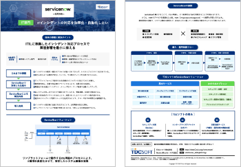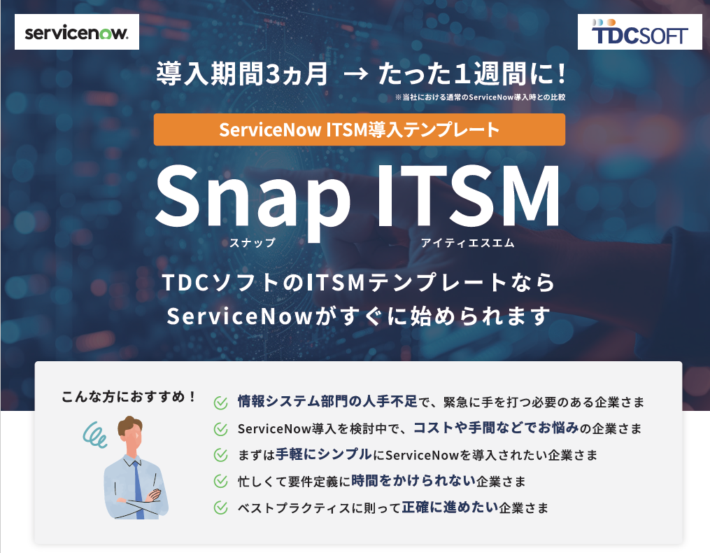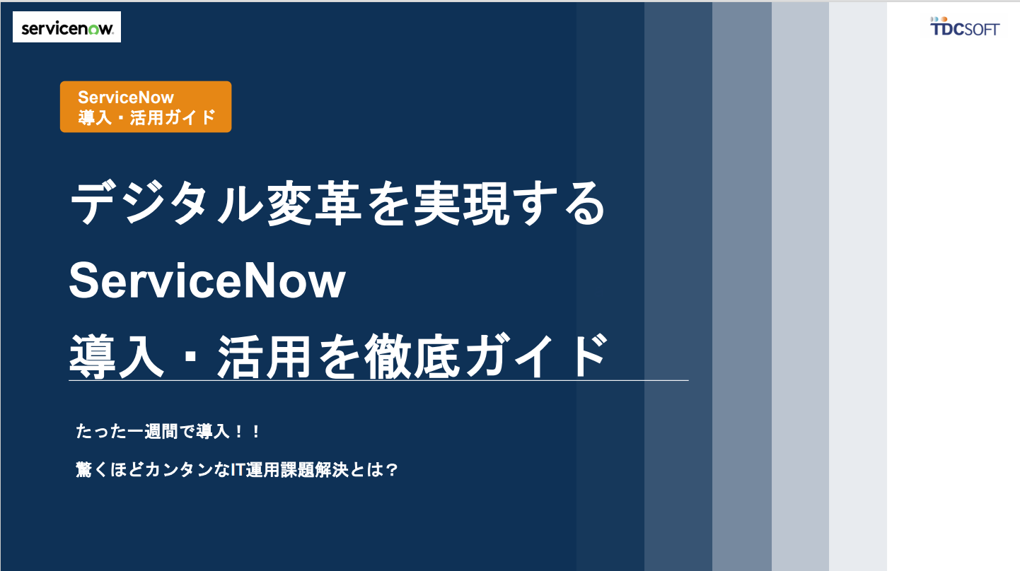 ServiceNowの概要や特長、TDCソフトの強み、部門別活用方法や導入の流れなどを掲載しています。貴社のビジネスがどう変化するのか?まずはこちらの資料でお確かめください。